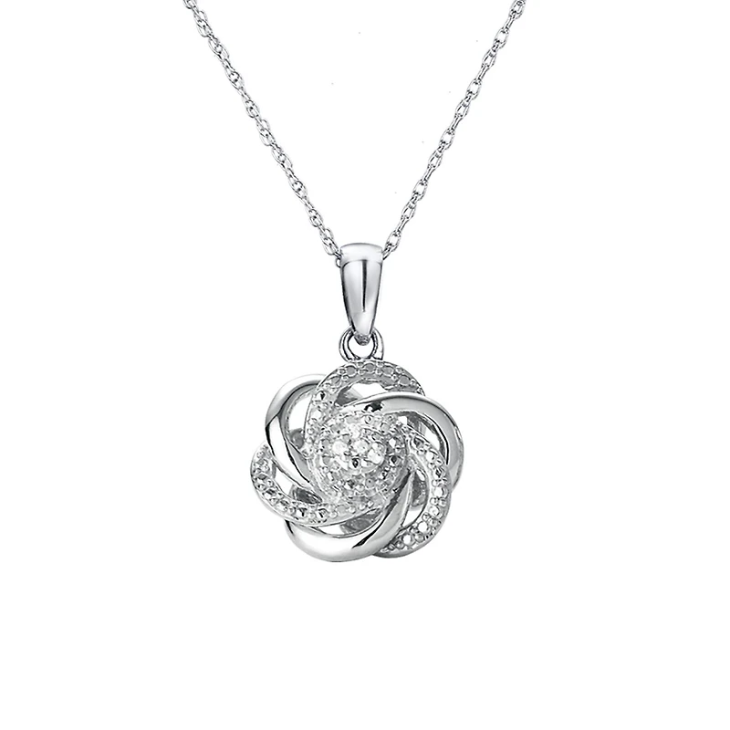 Swirling sterling silver creates this Love Knot pendant. A symbol of connection of two lovers this pendant shines with near colourless round diamonds for a total weight of 0.02 carats. This pendant suspends from an 18" chain with secure clasp.