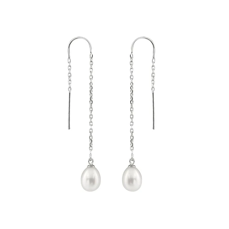 Sterling silver rhodium plated earrings with 7½-8mm dangling rice shape freshwater pearls.