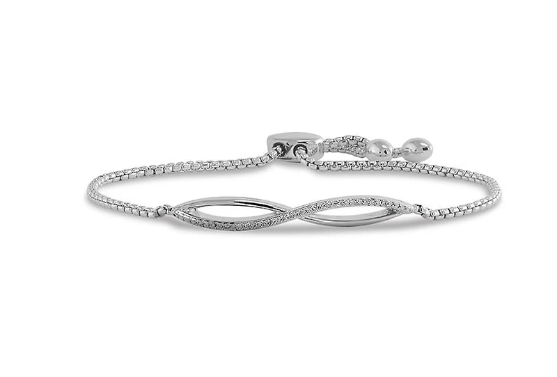 This adjustable infinity bracelet glittering with a row of diamonds is set in sterling silver and makes the perfect addition to your arm party. Beauty is always in fashion.