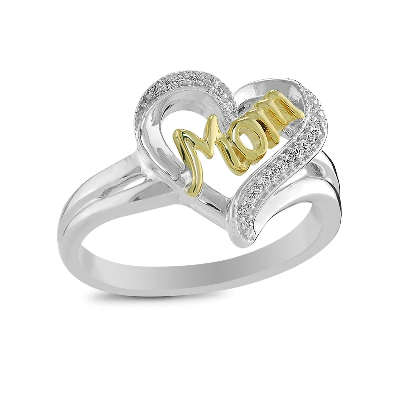 Give her a gift from the heart with this sterling silver and yellow gold mom ring. Sparkling with diamonds, this ring is the perfect way to say, “I love you, Mom.”