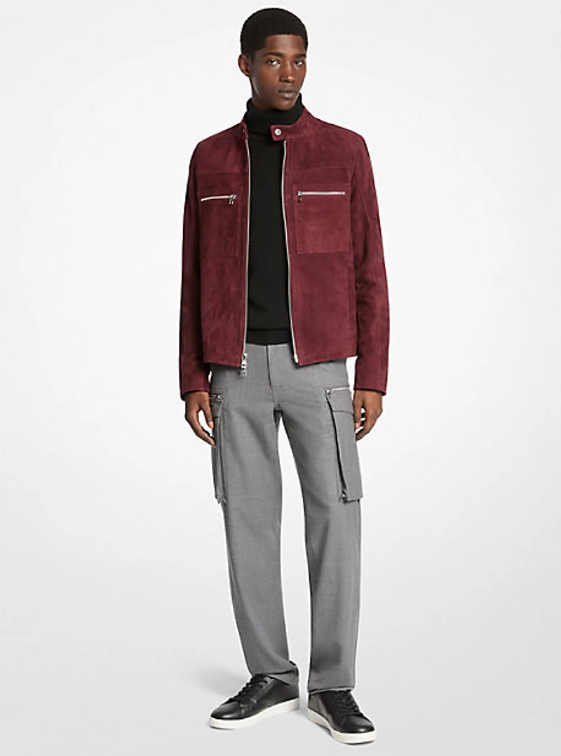 This jacket makes a strong case for texture with its sumptuous suede construction and modern racer silhouette. The stand collar fastens with snap buttons, while two double zip pockets provide plenty of storage. Use it to add edge to a neutral look. 100% of the leather in this product comes from tanneries receiving leather working group gold- or silver-certification in recognition of their environmental performance.