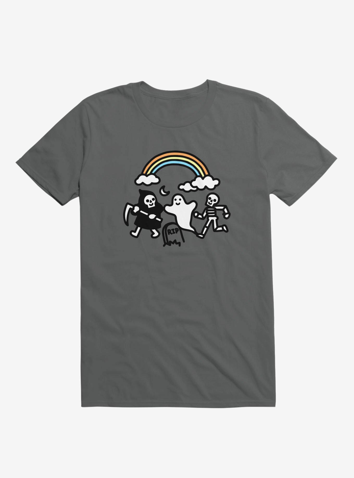 Grim Reaper doodle? Spooky. Headstone doodle? Spooky. Ghost doodle? Spooky. Skeleton doodle? Spooky. Uhh... rainbow doodle? SUPER spooky. (Wink.) This lightweight asphalt grey tee features a graphic that's about 90% creepy. Officially licensed art from Obinsun.