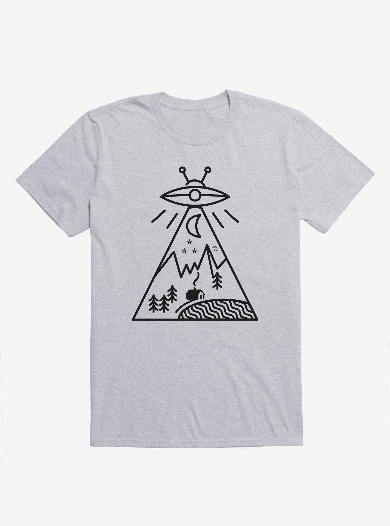 Life origins to a tee. A tranquil mountain scene with the moon, stars, trees, a lake and a cabin appears alongside an otherworldly graphic on this lightweight sport grey T-shirt. Officially licensed art from 38Sunsets.