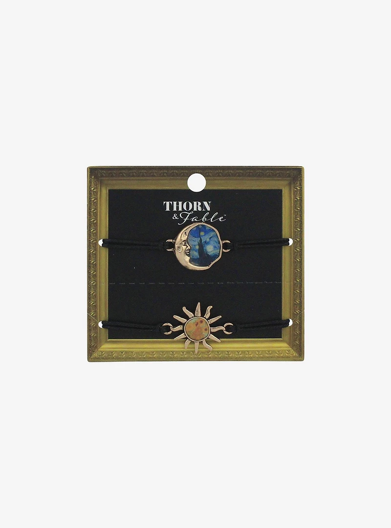 Who's the sun to your moon? Grab this cord bracelet set and share it with your bestie. One bracelet shows a crescent moon with a Van Gogh painting in the background. The other bracelet shows a sun with Van Gogh's sunflowers in the center.