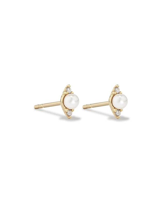 Three Stone Cultured Freshwater Pearl and Diamond Stud Earrings in 10kt Yellow Gold