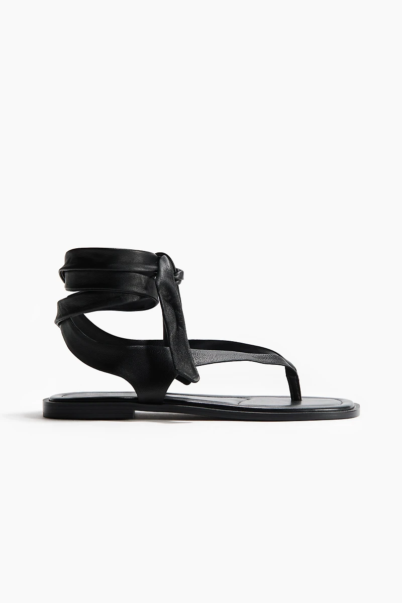 Sandals in soft leather featuring foot straps, a narrow toe post and wide ties that wrap around the ankle. Almond toes and lightly padded insoles.