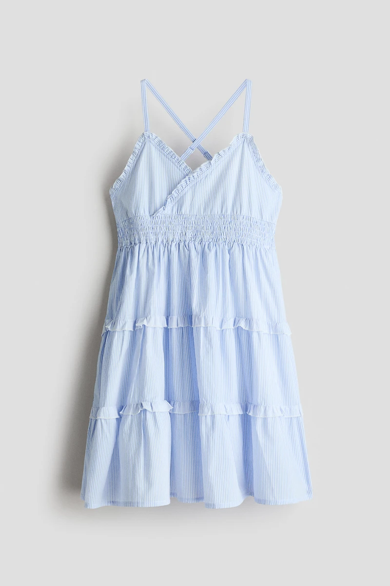 Dress in airy woven cotton with subtle ruffle trim at top. Narrow, adjustable shoulder straps crossed at back, V-neck with a sewn wrapover front, and smocking at back and at midsection. Flared skirt with ruffle-trimmed tiers. Lined.