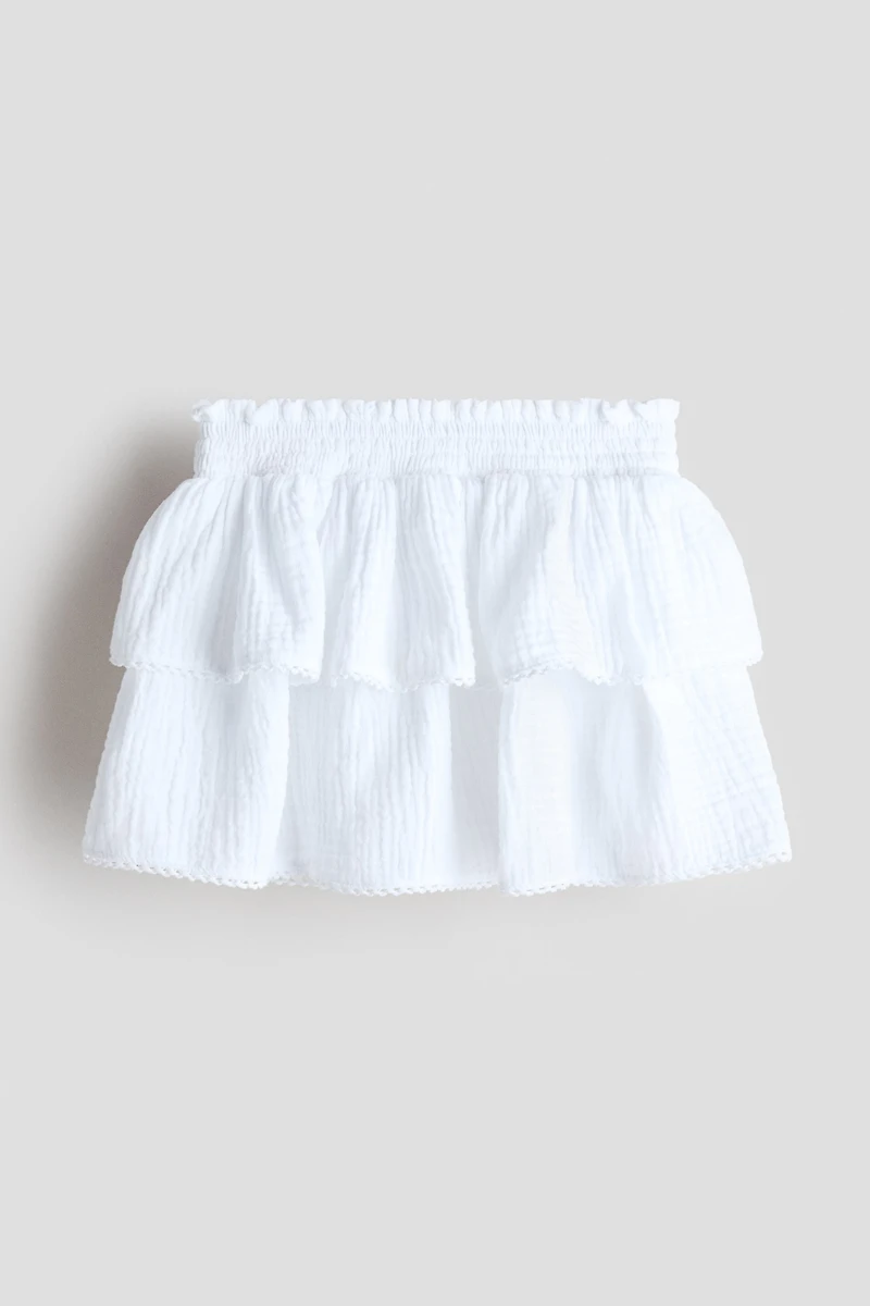 Tiered skirt in soft cotton muslin with picot-trimmed edges and a smocked, ruffle-trimmed waistband. Unlined.