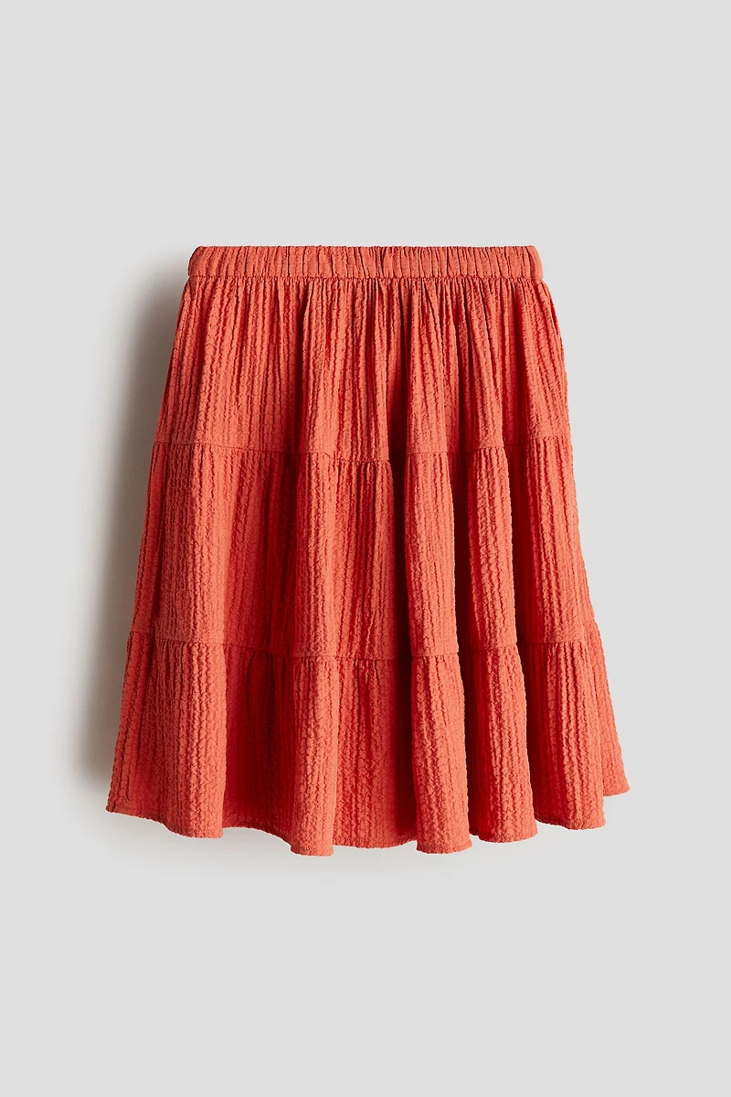 Skirt in airy seersucker with gathered seams for added volume. Covered elastic at waistband and a straight-cut hem. Unlined.