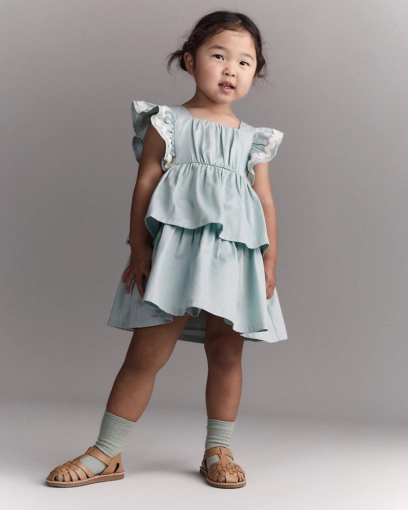 Elevate her wardrobe with this light blue tiered dress, designed for little trendsetters. Made from soft twill, it offers all-day comfort and easy movement. Perfect for playdates, family outings, or sunny days at the park, this stylish piece pairs effortlessly with her favorite sandals. Let her shine in a dress that blends fashion with functionality, making every moment a mini runway. Toddler-friendly taglessness? No question.
