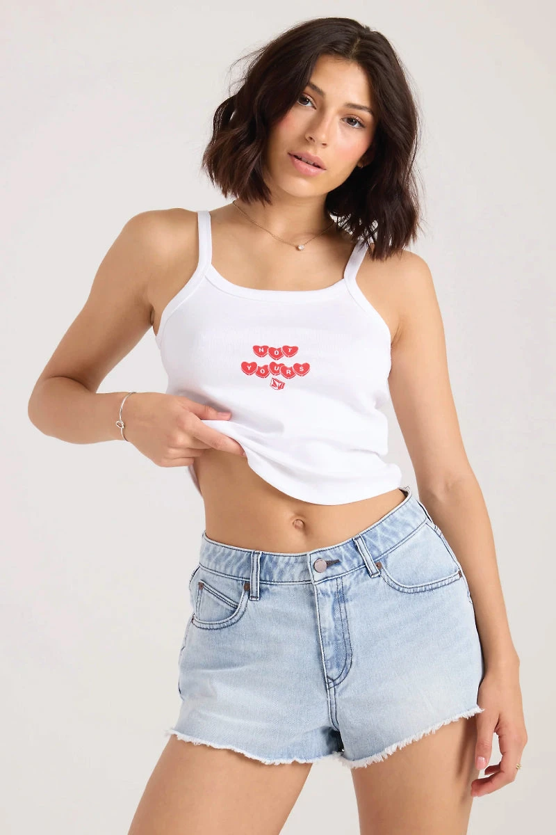 The Trippin Tank by Volcom cuts a clean line with a fitted 1x1 rib and skinny spaghetti straps, finished with a crisp screened "Not Yours" graphic and a tiny red heart hit at the lower back. Lightweight cotton keeps it breathable for sunny days, late nights, and everything between.