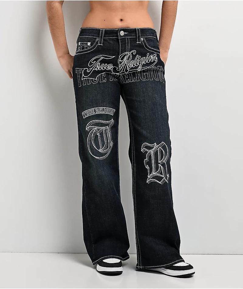 Y2K-inspired denim styling arrives with the Bobbi Big T mid rise baggy jeans from True Religion, finished in a faded Ice Meadow blue wash. Contrast stitching and embroidered graphics throughout the jeans highlight that signature True Religion look. A