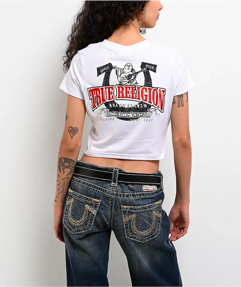 Designed in a clean white colorway, this Embroidered Logo t-shirt from True Religion features a cropped fit with subtle branding. A small printed horseshoe with red True Religion text sits on the left chest, while the back highlights a Buddha inside