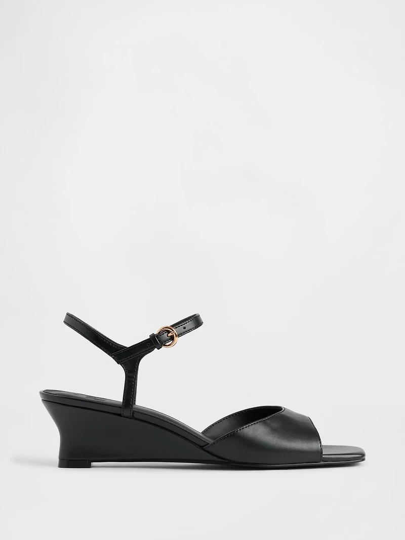 These sandals are made with a vegan leather upper. Adjustable buckle strap at top. Wedge heel.