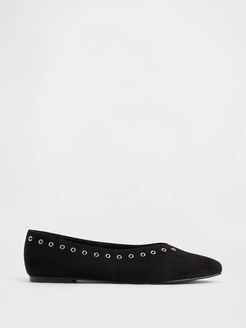 These ballet flats are made with a vegan suede upper. Rubber gripper sole. Pointed toe. Metal eyelet detailing at top.