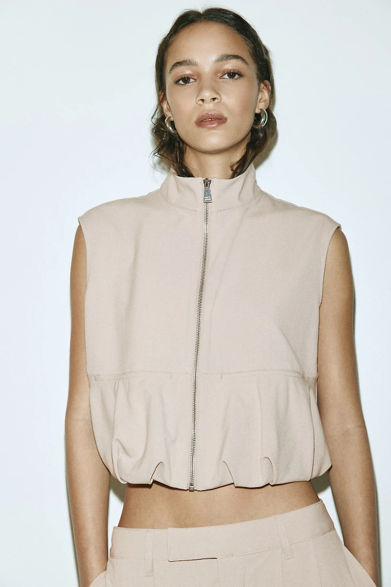 Veste sans manches en matière tissée. Modèle à col droit avec fermeture éclair devant. Fausses poches raglan devant. Bas à effet ballon pour une silhouette bouffante. Partiellement doublée.