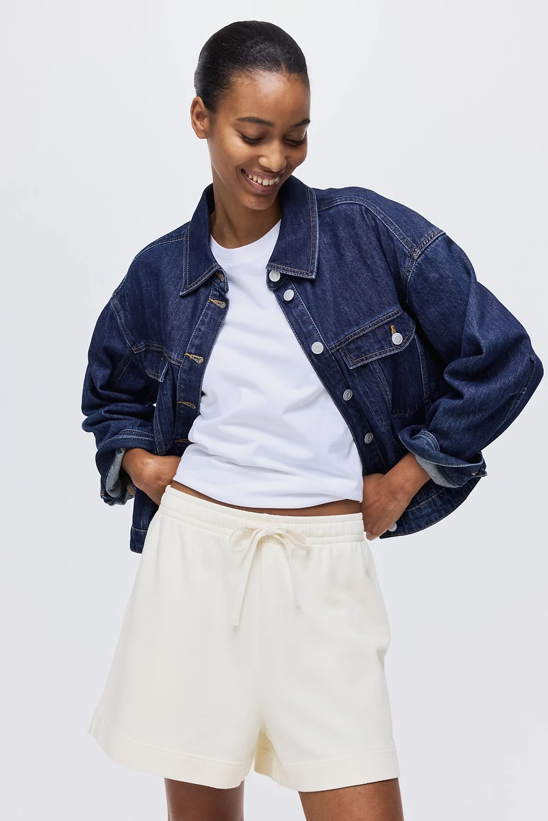 Loose-fit sweatshorts in lightweight cotton with a washed look. Drawstring and smocked elastic at waistband, discreet side pockets, and open back pockets. Slit at hems.