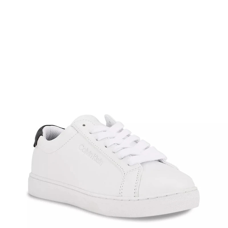 Fuse a dash of sporty appeal to your casual ensemble with these women's Calvin Klein Gules white/black sneakers. Made of polyurethane upper, these casual sneakers have a round toe front and a lace-up closure. Features include a padded collar and tongue, breathable mesh lining, lightly padded insole, plush footbed with Calvin Klein branding, tonal topstitching, debossed heel logo, and a molded rubber outsole.