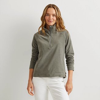 For summits, sofas, and everything in between. This 1/4-zip pullover features a soft, brushed fleece interior which retains warmth while remaining breathable. Four-way stretch enhances mobility, keeping you comfortable during active pursuits, but it's also perfect for running errands on the weekend and chilling with friends. Models shown are 5'9" to 5'11" tall, wearing size S/4 or L/12.