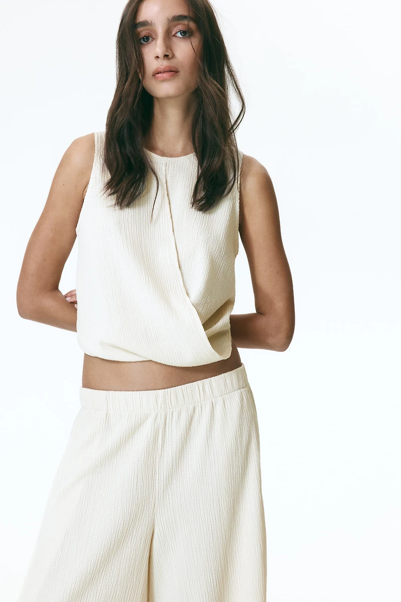 Short, sleeveless top in crinkled jersey. Round neckline, and a wrap detail at front finishing in a bubble hem for a puffy silhouette.