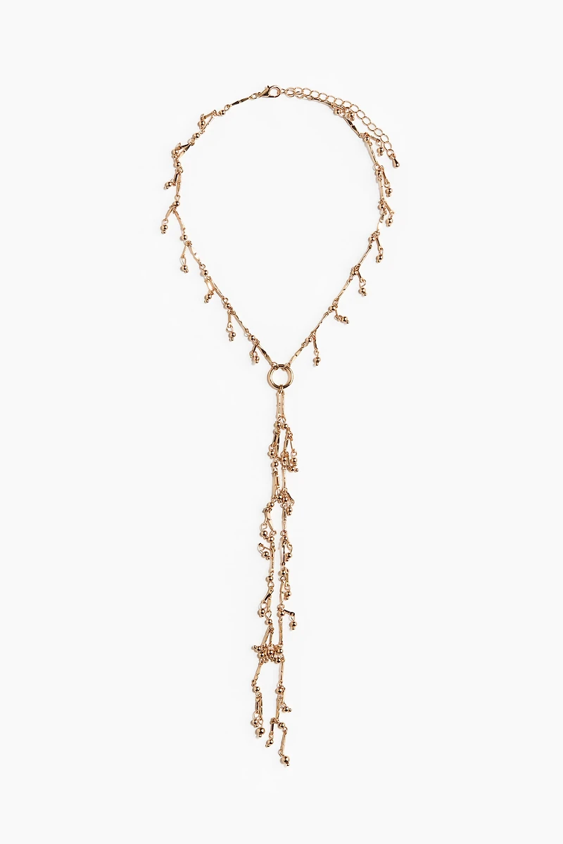 Y-shaped necklace fashioned from a narrow metal chain with clusters of beads. Adjustable length with trigger clasp.