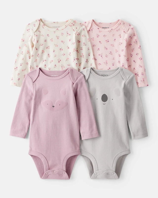Baby Girl 4-Pack Koala Print Cotton Long-Sleeve Multipack Bodysuits - Purple/White/Pink